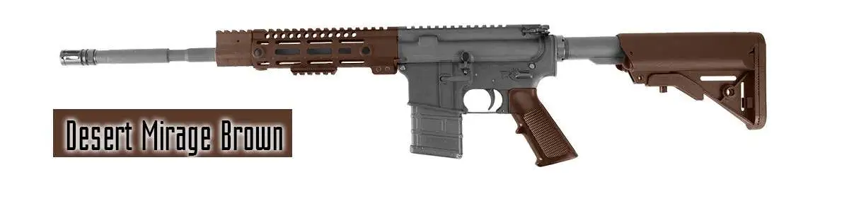 Colors: Desert Brown, Tiger Stripe Brown, Desert Mirage Brown, Wilderness Mirage Brown, Belgian Brown, Coyote Brown, Plum Brown, Bengal Brown, Advanced Tiger Stripe Brown, CADPAT Brown, Multi Light Brown, Multi Dark Brown, Rhodesian Brown, British DPM Brown, Russian Army Brown, German Flecktarn Brown, South African Brown, East German Brown, Russian Special Forces Brown, French Army Brown, Bushmaster ACR Handguard, Czech Republic Dark Brown, Desert DPM Dark Brown, Swiss Army Dark Brown, Desert Warrior Dark Earth, Swiss Army Tan, Magpul Flat Dark Earth, Norwegian Army Brown, Leupold Dark Earth, Bushmaster ACR Cheek Piece, EOTech Flat Dark Earth, XD Dark Earth, Trijicon Dark Earth Brown, Daniel Defense FDE, RAL 8000, GLK Dark Earth Early Model, ERGO Dark Earth, Accuracy Intl. Dark Earth, Woodland Camo Brown
