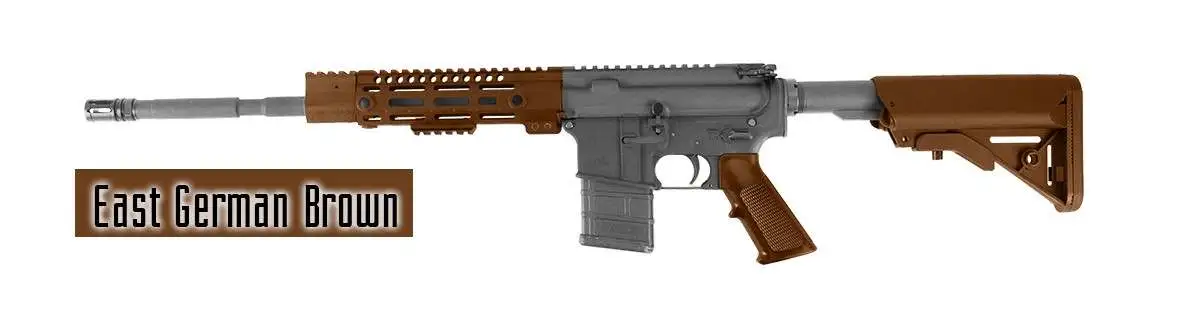 Colors: Desert Brown, Tiger Stripe Brown, Desert Mirage Brown, Wilderness Mirage Brown, Belgian Brown, Coyote Brown, Plum Brown, Bengal Brown, Advanced Tiger Stripe Brown, CADPAT Brown, Multi Light Brown, Multi Dark Brown, Rhodesian Brown, British DPM Brown, Russian Army Brown, German Flecktarn Brown, South African Brown, East German Brown, Russian Special Forces Brown, French Army Brown, Bushmaster ACR Handguard, Czech Republic Dark Brown, Desert DPM Dark Brown, Swiss Army Dark Brown, Desert Warrior Dark Earth, Swiss Army Tan, Magpul Flat Dark Earth, Norwegian Army Brown, Leupold Dark Earth, Bushmaster ACR Cheek Piece, EOTech Flat Dark Earth, XD Dark Earth, Trijicon Dark Earth Brown, Daniel Defense FDE, RAL 8000, GLK Dark Earth Early Model, ERGO Dark Earth, Accuracy Intl. Dark Earth, Woodland Camo Brown